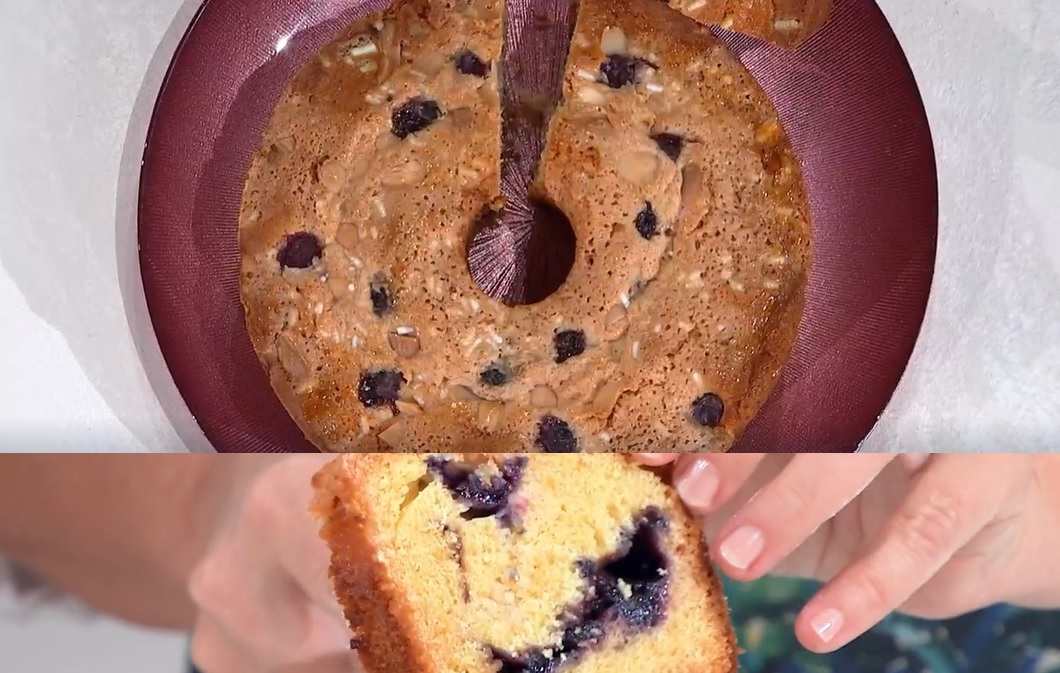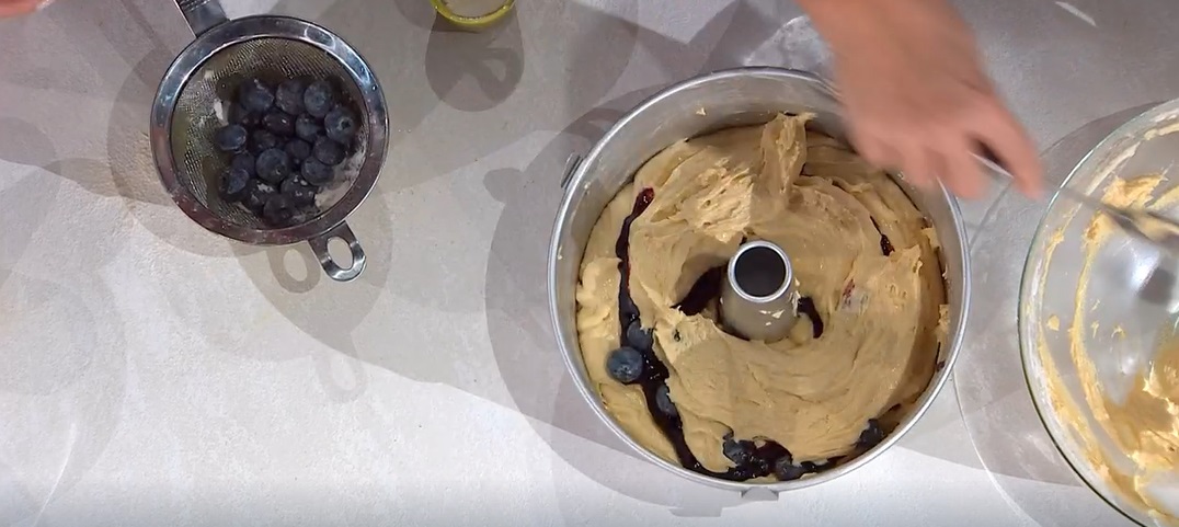 Imburriamo ed infariniamo una tortiera da ciambella (Natalia usa quella da chiffon cake) e versiamo sul fondo metà dell’impasto. Distribuiamo sopra e al centro la confettura di mirtilli, senza toccare i bordi. Mettiamo sopra anche parte dei mirtilli freschi infarinati. Copriamo con l’impasto rimasto e lo livelliamo. Con un cucchiaio, distribuiamo sopra la glassa alle mandorle (non serve essere precisi), finiamo con i mirtilli avanzati, mandorle intere e granella di mandorle. Cuociamo in forno caldo e statico a 170° per 50 minuti.