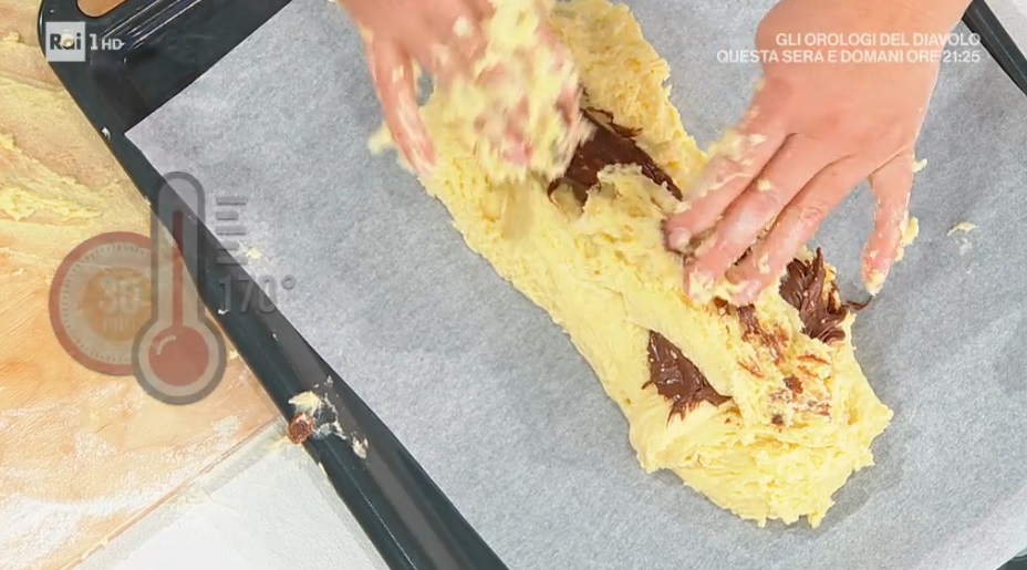 Formiamo un filone con un’altra parte dell’impasto, direttamente sulla teglia. Scaviamo leggermente al centro ed inseriamo la crema al cioccolato. Copriamo quest’ultima ripiegando l’impasto sul ripieno. Spolveriamo con lo zucchero semolato e cuociamo in forno caldo a 170° per 35-40 minuti.