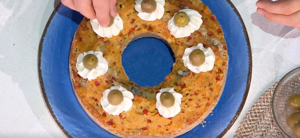 Per decorare, lavoriamo la robiola con olio, sale e pepe; la inseriamo in una sacca da pasticcere con bocchetta rigata. Decoriamo la cimabella con ciuffi di crema ed olive.