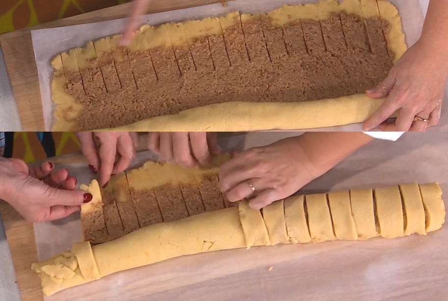 - Ripieno: 120 g noci tritate, 40 g biscotti secchi, 150 g marmellata all’arancia, 50 g burro, cannella, zenzero