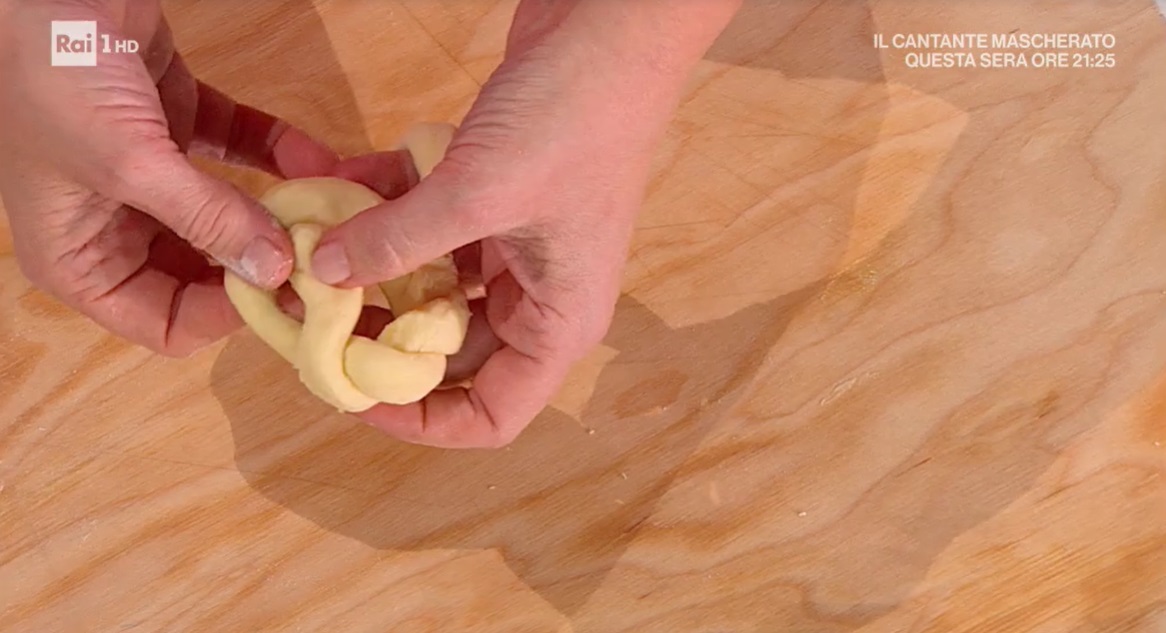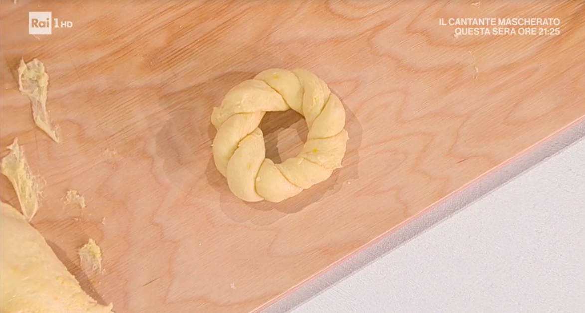 Prendiamo l’impasto lievitato e formiamo delle palline di circa 50 g. Allunghiamo ogni pallina, in modo da formare un cordoncino lungo circa 40 cm. Formiamo un tondo con il cordoncino e intrecciamo le due estremità sul cerchio formato, in modo da ottenere una ciambella intrecciata. Posizioniamo le ciambelline su quadrati di carta forno e lasciamo lievitare ancora 30 minuti, coperte.