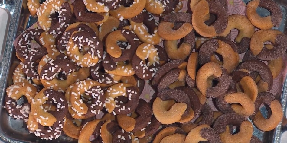 Con i due impasti, creiamo dei serpentelli sottili. Li tagliamo della lunghezza di circa 8 cm, quindi creiamo delle ciambelline, metà al cacao e metà alla vaniglia, come i famosi biscotti.