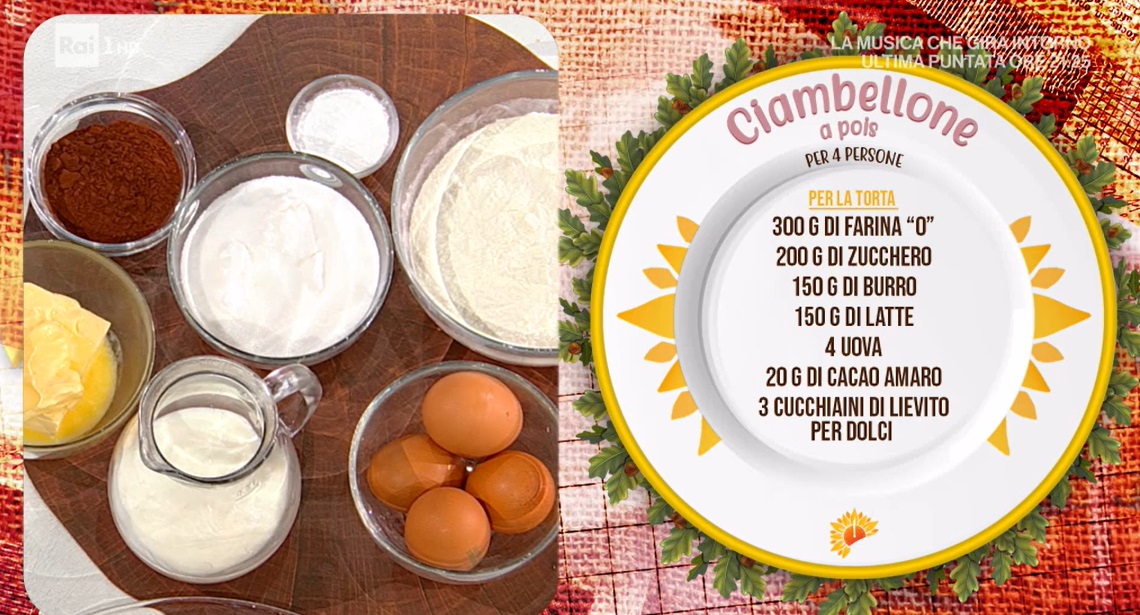 • 300 g di farina 0, 200 g di zucchero, 150 g di burro, 150 g di latte, 4 uova, 20 g di cacao amaro, 3 cucchiaini di lievito per dolci, 30 g di gocce di cioccolato
