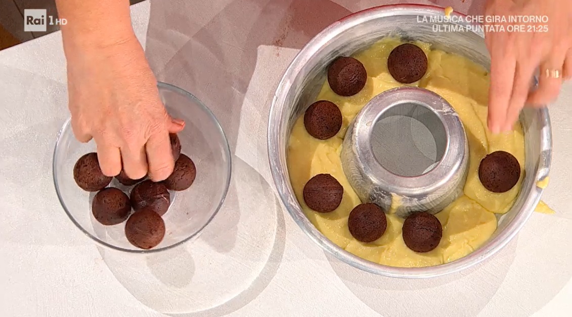 Aggiungiamo all’impasto giallo, quello rimasto, il lievito per dolci rimasto e mescoliamo. Imburriamo uno stampo da ciambella con lo staccante (qui la ricetta), quindi versiamo alla base un terzo dell’impasto bianco, disponiamo sopra i quadratini (o sfere) di impasto al cioccolato cotto e copriamo con l’impasto bianco rimasto. Cuociamo in forno caldo e statico per 30 minuti a 180º.