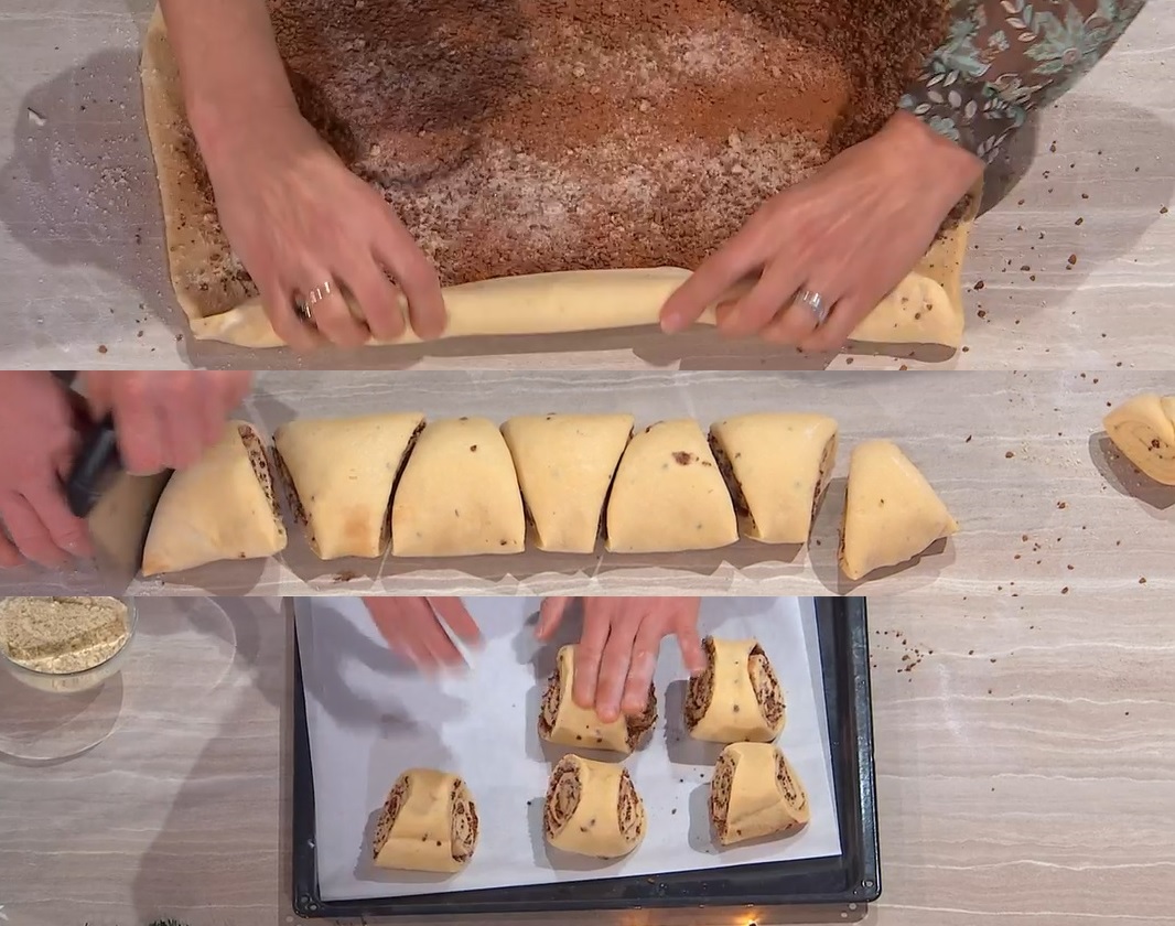 Allarghiamo l’impasto sul piano con il mattarello, fino ad ottenere un rettangolo spesso mezzo cm. Spennelliamo con il burro a pomata o fuso e spargiamo sopra il caffè solubile, la farina di mandorle, la cannella e lo zucchero semolato. Arrotoliamo l’impasto sul ripieno, partendo dal lato lungo, in modo da ottenere un rotolo stretto. Tagliamo a fette spesse circa 5 cm (devono essere triangolari, come in foto). Le disponiamo su una teglia e le schiacciamo leggermente. Copriamo e lasciamo lievitare al caldo per 1 ora e 20 minuti.