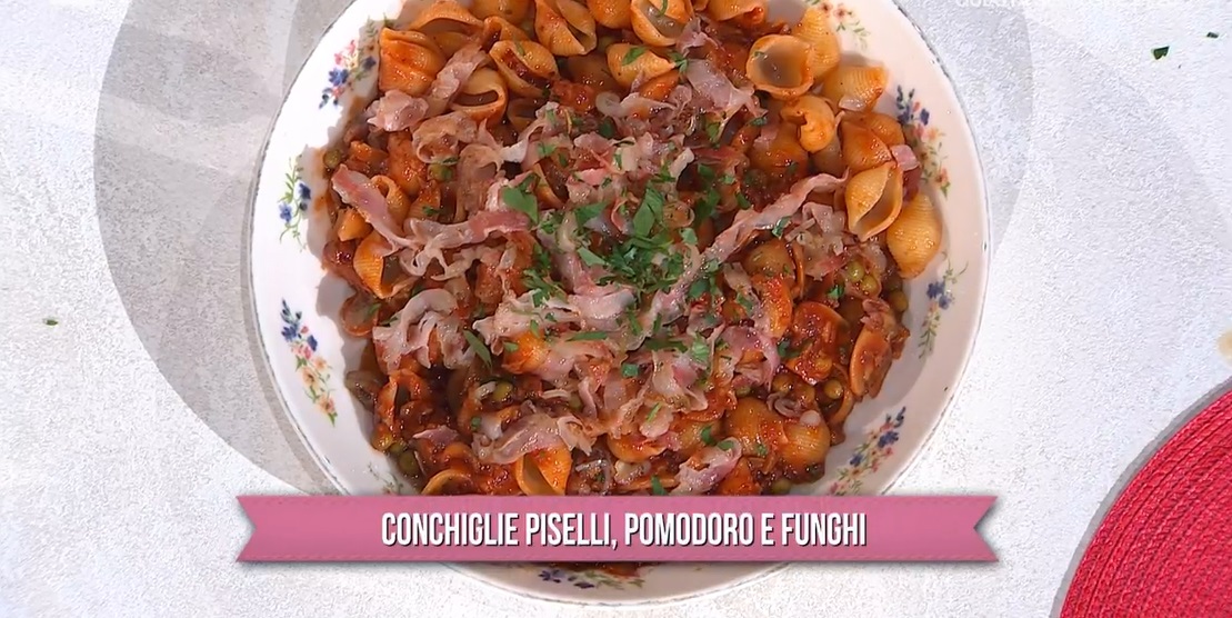 - 320 g conchiglie, 2 scalogni, 80 g pancetta arrotolata, 150 g piselli gelo, 300 g funghi champignon, 40 g funghi porcini secchi, 300 g passata di pomodoro, 50 g concentrato di pomodoro, prezzemolo, timo, erba cipollina, olio evo, sale e pepe