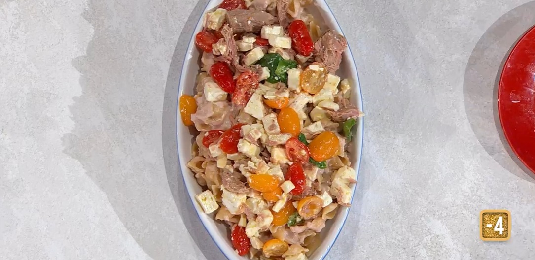 - 400 g conchiglie, 200 g mortadella a fette, 100 g feta, 80 g stracchino, 200 g tonno sott’olio, 6 pomodorini rossi, 6 pomodorini gialli, 50 g anacardi, erba cipollina, 1 limone, basilico, sale e pepe, olio evo