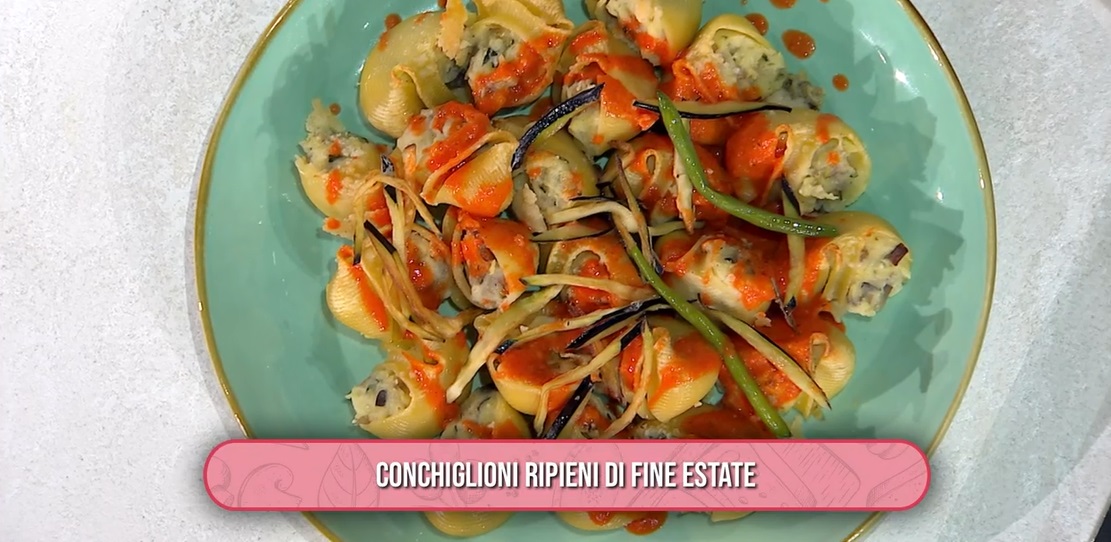 - 300 g conchiglioni, 4 patate, 4 zucchine, 2 melanzane, 160 g provola affumicata, 50 g formaggio grattugiato, 500 g datterini, 100 g fagiolini, 1 spicchio d’aglio, 1 scalogno, 1 uovo, basilico, olio di semi, olio evo, sale e pepe