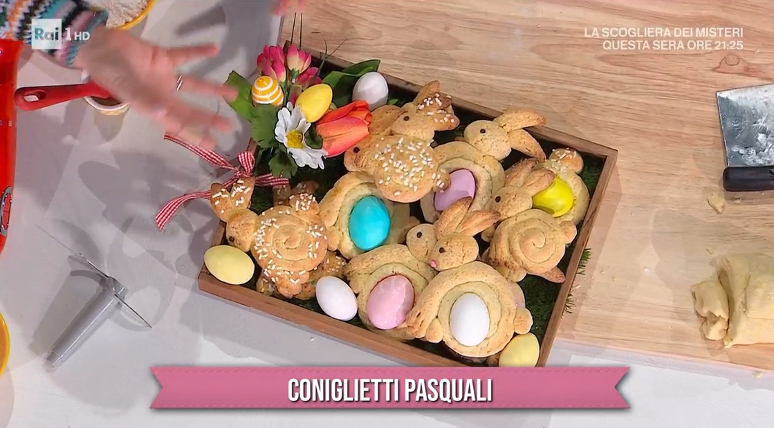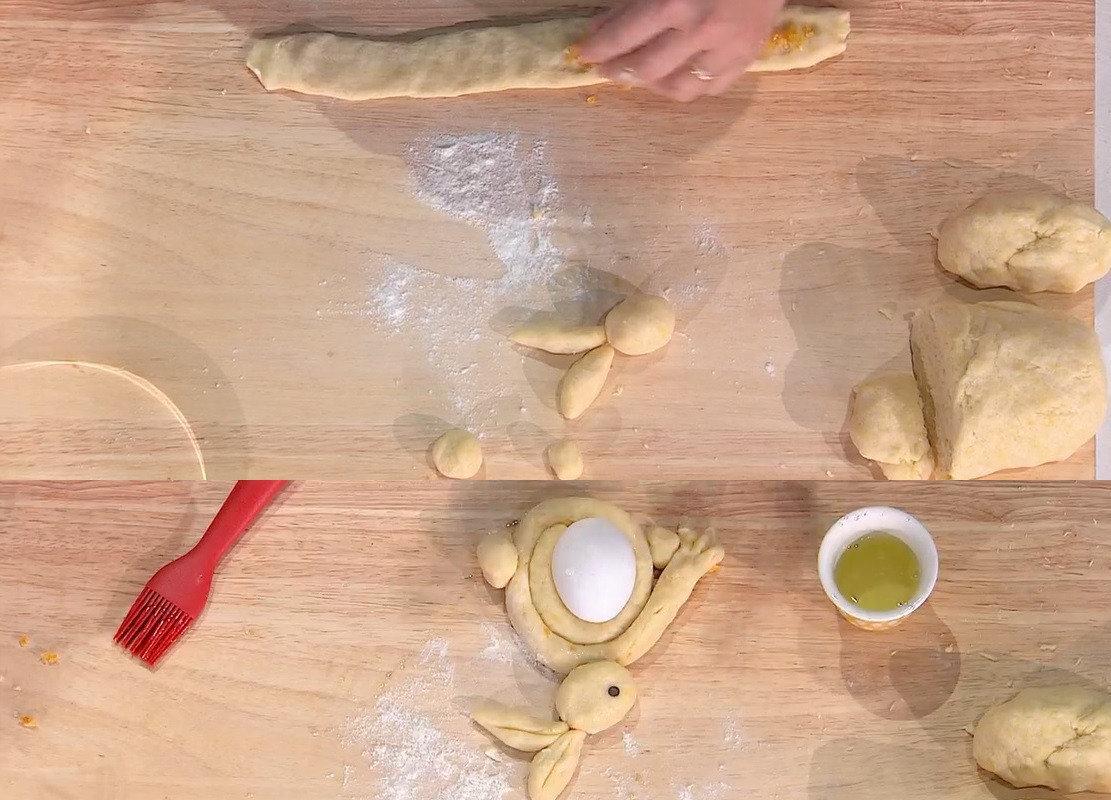 Dividiamo l’impasto in porzioni da 150 g circa. Diamo la forma di un filoncino, quindi tagliamo via una fettina e la arrotondiamo, formando la testa. Tagliamo via altre due fettine e diamo la forma di orecchie. Ricaviamo ancora una pallina più grande ed una più piccola, per la zampa e la coda. Con la porzione di filoncino rimasto, formiamo il corpo: lo appiattiamo, formando una lingua lunga, distribuiamo sopra il ripieno all’arancia e richiudiamo l’impasto sul ripieno. Arrotoliamo il serpentello ottenuto intorno ad un uovo con il guscio (possiamo evitarlo ed arrotolare il serpentello su se stesso). Con l’albume, spennelliamo ed attacchiamo la testa, le orecchie, la coda e la zampina. Con le gocce di cioccolato creiamo un occhio e decoriamo a piacere con codette, zucchero colorato ecc. Posizioniamo i coniglietti sulla teglia e cuociamo in forno caldo e statico a 170° per 20 minuti.