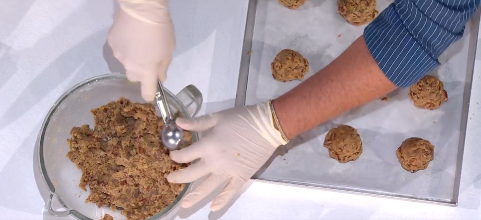 Mettiamo l’essenza o la bacca di vaniglia, un uovo intero e un tuorlo. Lasciamo amalgamare, poi uniamo i gherigli di noci sminuzzati e il cioccolato al latte a scaglie e lasciamo che vengono assorbiti nell’impasto. Lasciamo riposare l’impasto in frigorifero. Da freddo, con lo spallinatore da gelato, ricaviamo delle palline, che mettiamo, distanziati, su una placca foderata con carta forno. Inforniamo a 180⁰ per 15 minuti.