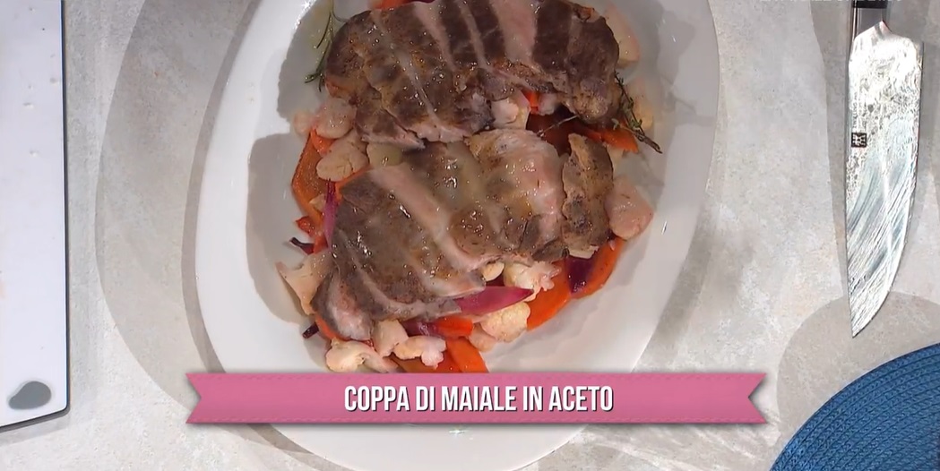 - 2 fette di coppone di maiale, 100 g sale grosso, 1 peperone rosso, 1 cipolla rossa, 2 carote, mezzo cavolfiore, 1 spicchio d’aglio, 100 g zucchero, 200 ml aceto bianco, 200 ml vino bianco, 2 cucchiai di amido di mais, timo, rosmarino, olio, sale e pepe