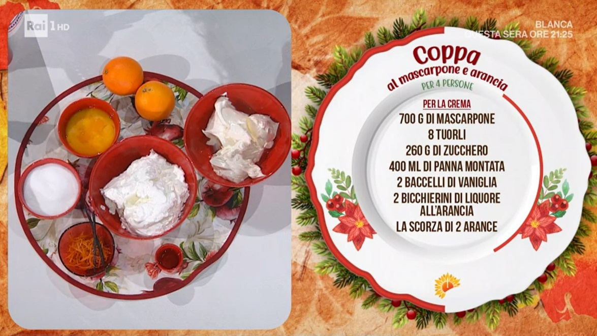 coppa di mascarpone e arancia di Daniele PerseganiDopo una lunga convalescenza, seguito ad un intervento inatteso, Zia Cri torna in cucina con la consueta verve, ma è Daniele Persegani a cucinare per lei, per consentirle di recuperare appieno le energie. Il cuoco emiliano prepara un dessert perfetto per le feste, la coppa di mascarpone e arancia.