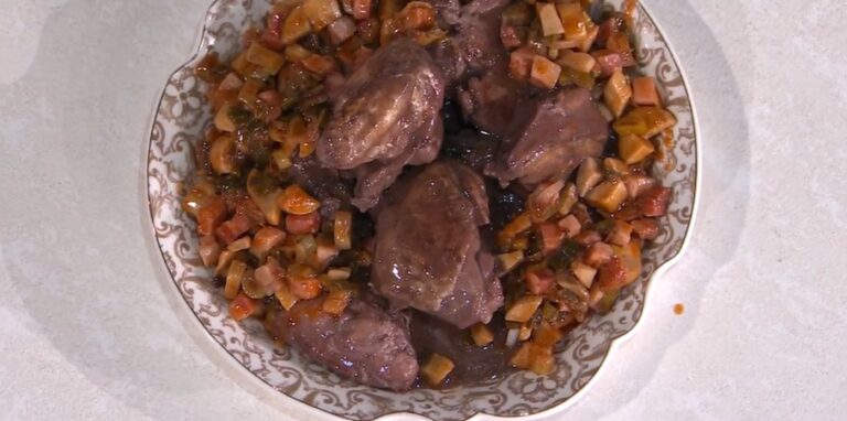 Contorno: scaldiamo una padella con un filo d’olio e mettiamo a rosolare la pancetta a listarelle. Dopo qualche minuto, uniamo i funghi freschi a dadini, il cipollotto a spicchi, il concentrato di pomodoro e lasciamo rosolare per bene. Copriamo il tutto con altro vino rosso e lasciamo cuocere per circa 40 minuti.