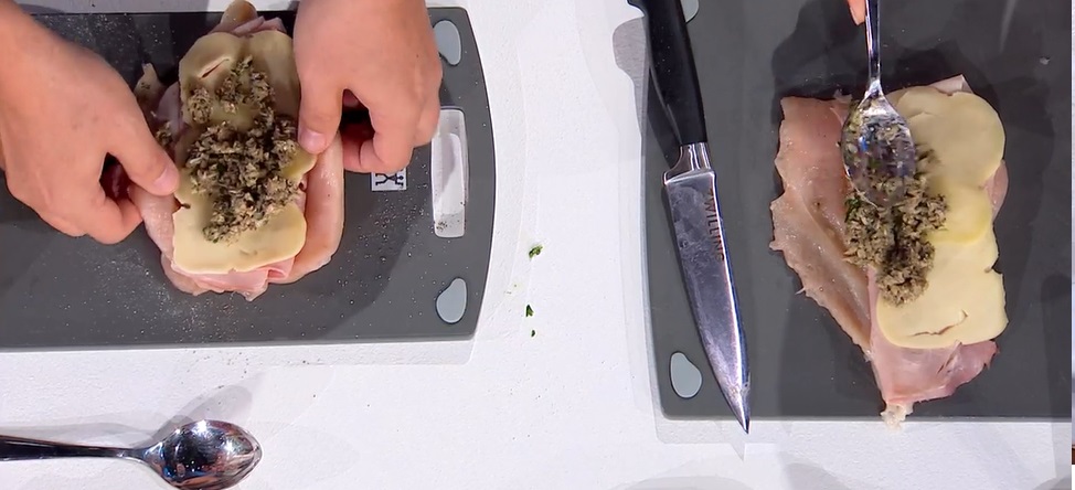 Battiamo le fette di pollo, in modo da assottigliarle (oppure, usiamo un petto di pollo, da cui ricaviamo una tasca). Inseriamo tra due fette il prosciutto affettato, le fette di formaggio ed un po’ di funghi (possiamo evitarli). Pressiamo bene ai bordi delle due fette di pollo.