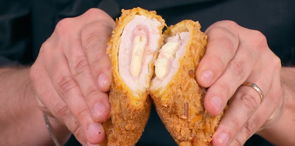 A questo punto, con una siringa, Mainardi inserisce del burro al cuore del cordon bleu. Possiamo evitarlo. Mettiamo a friggere in olio profondo a 160°, rigirandolo fino a doratura uniforme.
