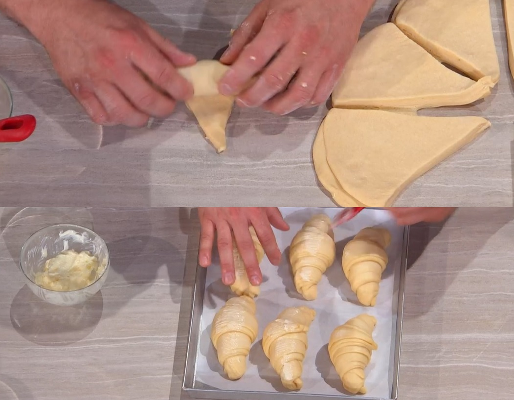 Arrotoliamo ciascun triangolino ottenuto su se stesso, partendo dalla base: avremo ottenuto i cornetti. Li disponiamo su una teglia, copriamo con la pellicola e lasciamo lievitare fino al raddoppio.