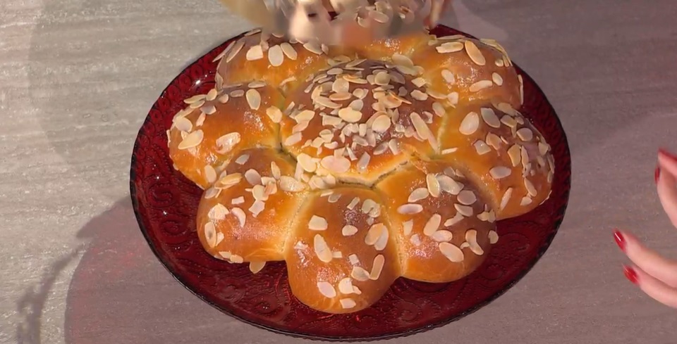 - 1 kg farina 0, 25 g lievito di birra fresco, 100 ml acqua, 150 g zucchero, scorza d’arancia, 400 g uova, 20 g sale, 250 g burro, 1 mandorla, 1 uovo per spennellare