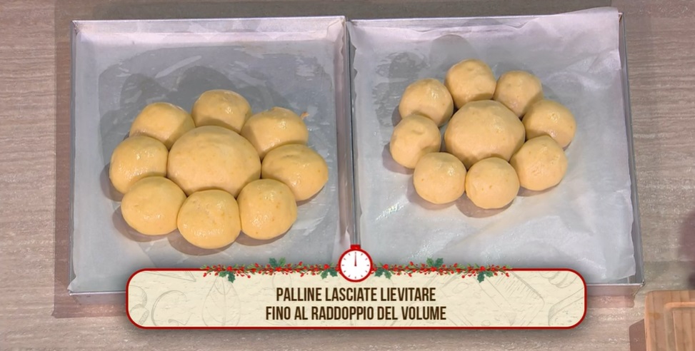 Ricaviamo una pallina grande come un’arancia e, dall’impasto rimasto, ricaviamo 8 palline più piccole, che arrotondiamo e disponiamo su una teglia con carta forno. Le lasciamo riposare per 10 minuti.