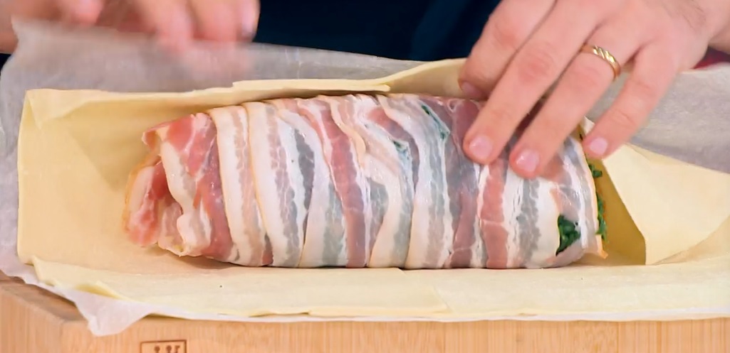 Su un foglio di pellicola, adagiamo la pancetta affettata, sovrapponendo leggermente le fette e creando un rettangolo. Distribuiamo sopra gli spinaci ripassati in padella e schiacciamo sopra le patate lesse: creiamo uno strato uniforme. Posizioniamo sopra il cotechino già cotto, quindi arrotoliamo il tutto (pancetta, spinaci e patate) sul cotechino, aiutandoci con la pellicola. Chiudiamo quest’ultima a caramella e mettiamo a raffreddare in frigorifero.