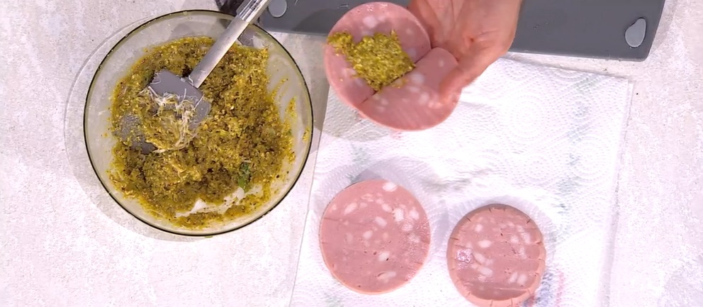 Scoliamo le fette di mortadella e riempiamo la tasca creata con un cucchiaio di pesto di pistacchio (foto). Passiamo la mortadella nella farina, nelle uova sbattute con il formaggio grattugiato e, infine, nel pangrattato; ancora nelle uova e nel pangrattato (facoltativa). A questo punto, possiamo congelarle o cuocerle direttamente. Friggiamo in olio caldo e profondo fino a doratura.