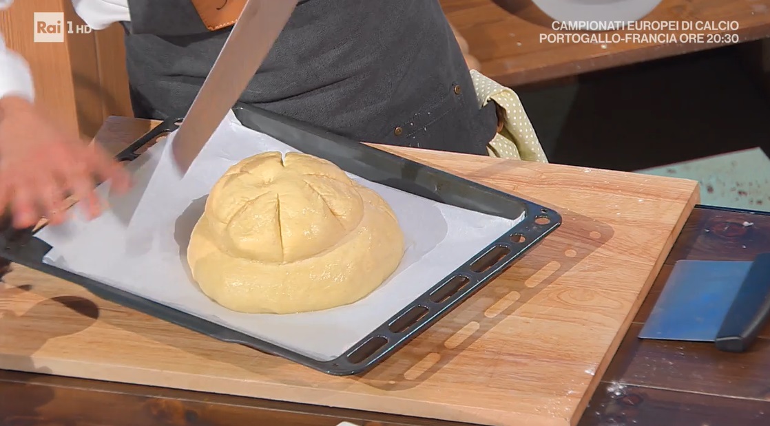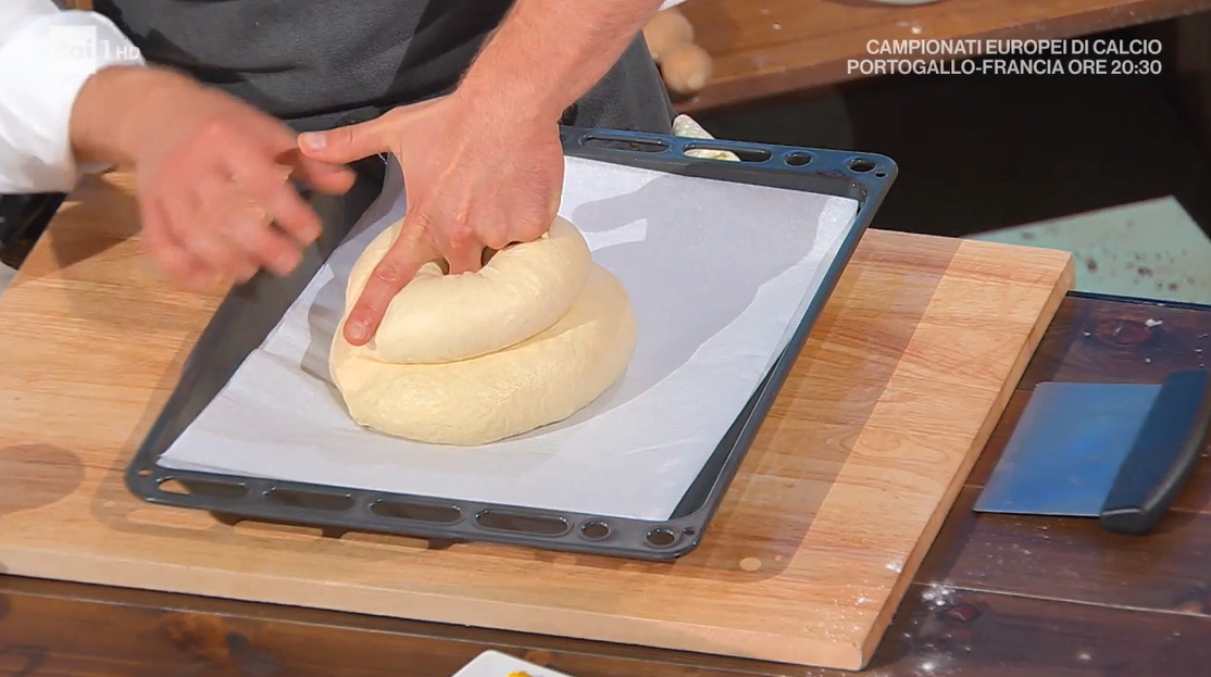 Dividiamo l’impasto in due parti (una con 2/3 dell’impasto; l’altra con 1/3 dell’impasto) e ripieghiamo ogni parte su se stessa, per 2-3 volte, fino ad ottenere due pagnotte ben strette. Mettiamo la pagnotta più piccola su quella più grande. Posizioniamo sulla teglia con carta forno e pressiamo un dito al centro, in modo da unirle. Copriamo e lasciamo lievitare fino al raddoppio.