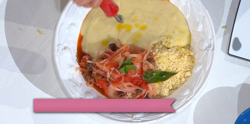 Trascorso qualche minuto, sgraniamo il couscous con una forchetta e lo condiamo con abbondante olio evo. Mettiamo il couscous alla base di un piatto e distribuiamo sopra le cipolle al pomodoro e la salsa di patate.