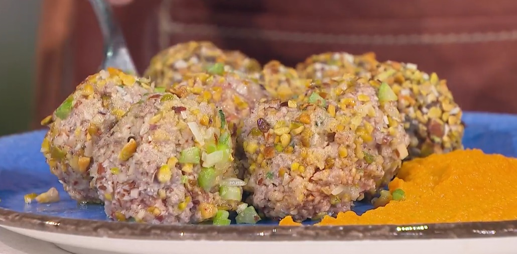Polpette: in una ciotola, mettiamo il macinato di manzo, il formaggio grattugiato, le uova, un po’ di pangrattato, mandorle e pistacchi in granella. Lavoriamo il composto, fino a renderlo omogeneo. Formiamo le polpettine e le passiamo nel latte e, successivamente, in un misto di mandorle e pistacchi in granella.