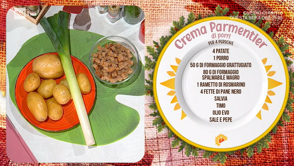 - 4 patate, 1 porro, 50 g formaggio grattugiato, 80 g formaggio spalmabile magro, 1 rametto di rosmarino, 4 fette di pane nero, salvia, timo, olio evo, sale e pepe