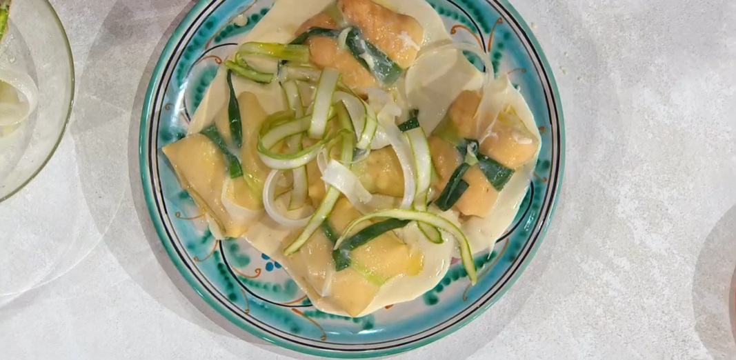 Diluiamo la mornay ottenuta con la panna e la serviamo con le crepes. Finiamo con le tagliatelle di asparagi crudi.