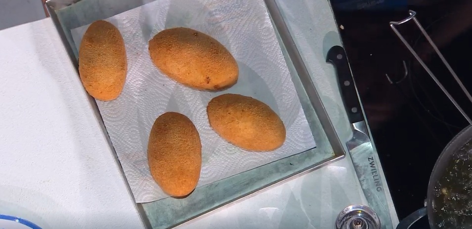 Lo passiamo nell’albume sbattuto e nel pangrattato e ancora negli albumi e nel pangrattato. Friggiamo in olio caldo a 160° e profondo, fino a doratura. Possiamo friggerli tutti e tenerli caldi in forno socchiuso a 80-100°.