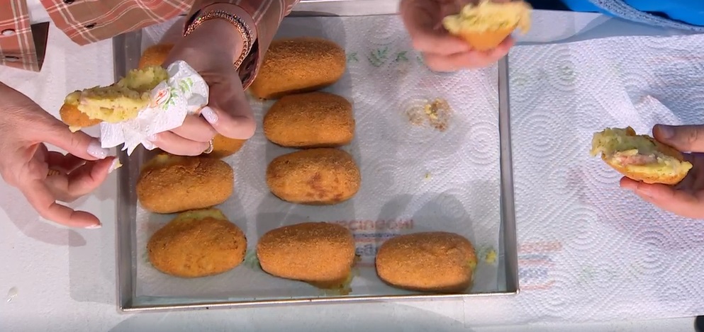 Lavoriamo le patate schiacciate ed ormai fredde con l’uovo intero, il formaggio grattugiato ed il prezzemolo tritato; se gradita, della noce moscata e del pepe. Ottenuto un composto omogeneo, ne preleviamo un pugno ed inseriamo al centro un po’ di prosciutto cotto e mozzarella.