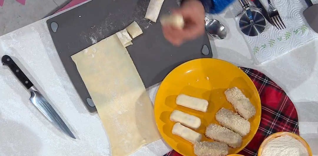 Tiriamo la sfoglia sottile ed avvolgiamo i rettangoli di ripieno nella sfoglia. Possiamo friggerle così, oppure le passiamo in una pastella di acqua e farina e, successivamente, nel panko o pangrattato. Friggiamo in olio caldo e profondo fino a doratura. Serviamo calde.