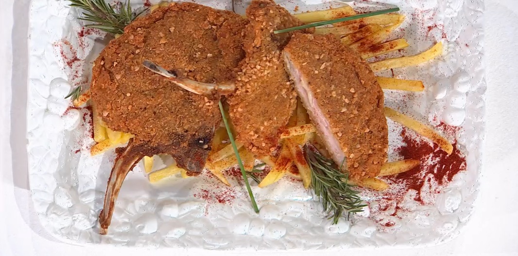 Facciamo una pastella amalgamando la farina con 2 uova e un goccio di acqua. Impaniamo le costolette passandole nella pastella e successivamente nel pane grattugiato mescolato alla granella di mandorle. Le friggiamo in olio fino a doratura uniforme.