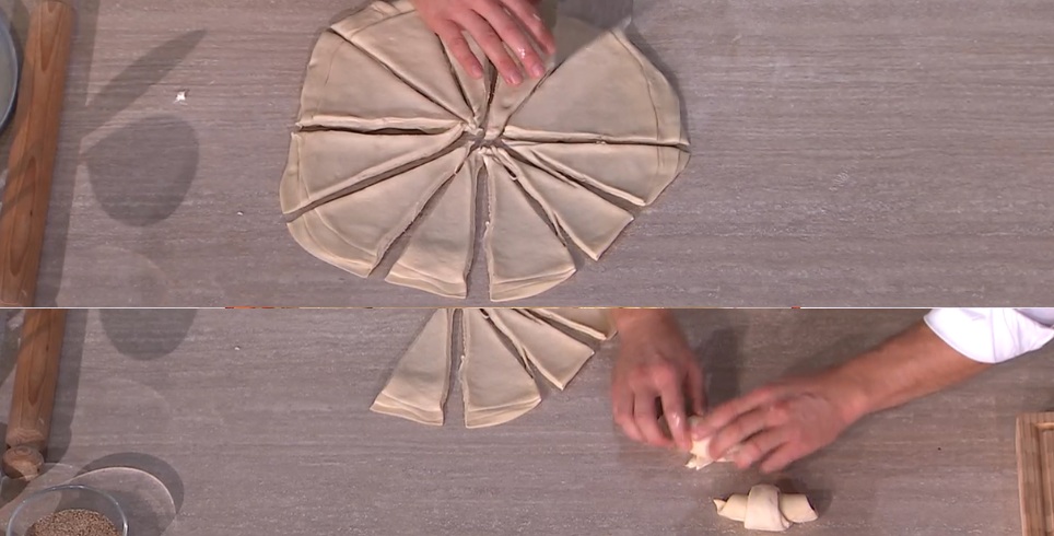 Arrotoliamo ogni spicchio su se stesso, partendo dalla base verso il vertice. Disponiamo i croissant sulla teglia con carta forno, copriamo e lasciamo lievitare per 1 ora e mezza a temperatura ambiente.