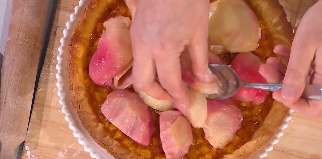 Prendiamo il guscio di frolla ormai freddo e versiamo all’interno le pesche spadellate ed ancora tiepide. Disponiamo sopra le pesche sciroppate (quelle a metà). Finiamo con ciuffi di chantilly alla menta.