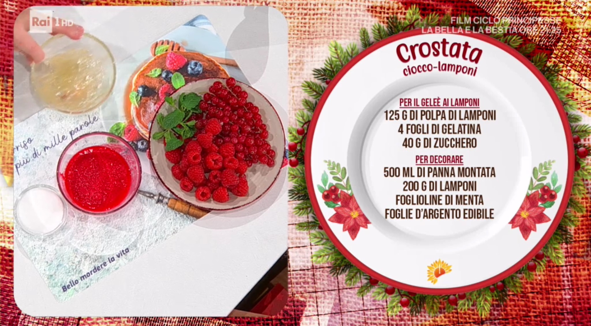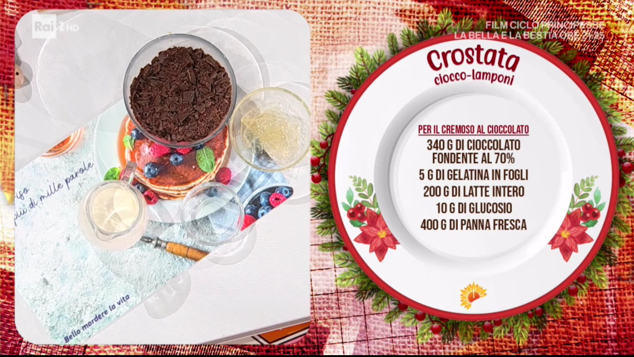 A festeggiare Santo Stefano insieme ai protagonisti di E’ sempre mezzogiorno la conduttrice Licia Colò, che assiste con piacere alla preparazione del primo piatto della puntata, ad opera della capacissima zia Cri. Ecco la crostata ciocco-lamponi.