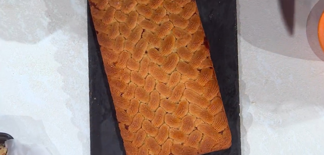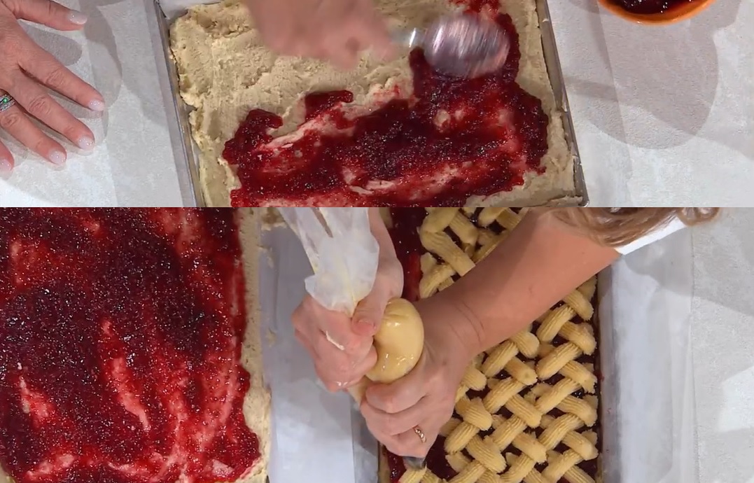 Spalmiamo sopra la confettura scelta. Inseriamo l’impasto rimasto in una sacca da pasticcere con bocchetta rigata e disegniamo sulla confettura delle ‘X’, intrecciandole tra loro. Cuociamo in forno caldo e statico a 180° per 45 minuti.