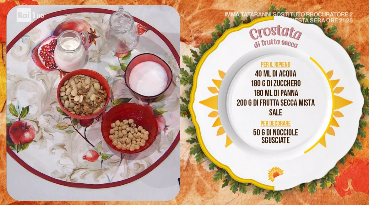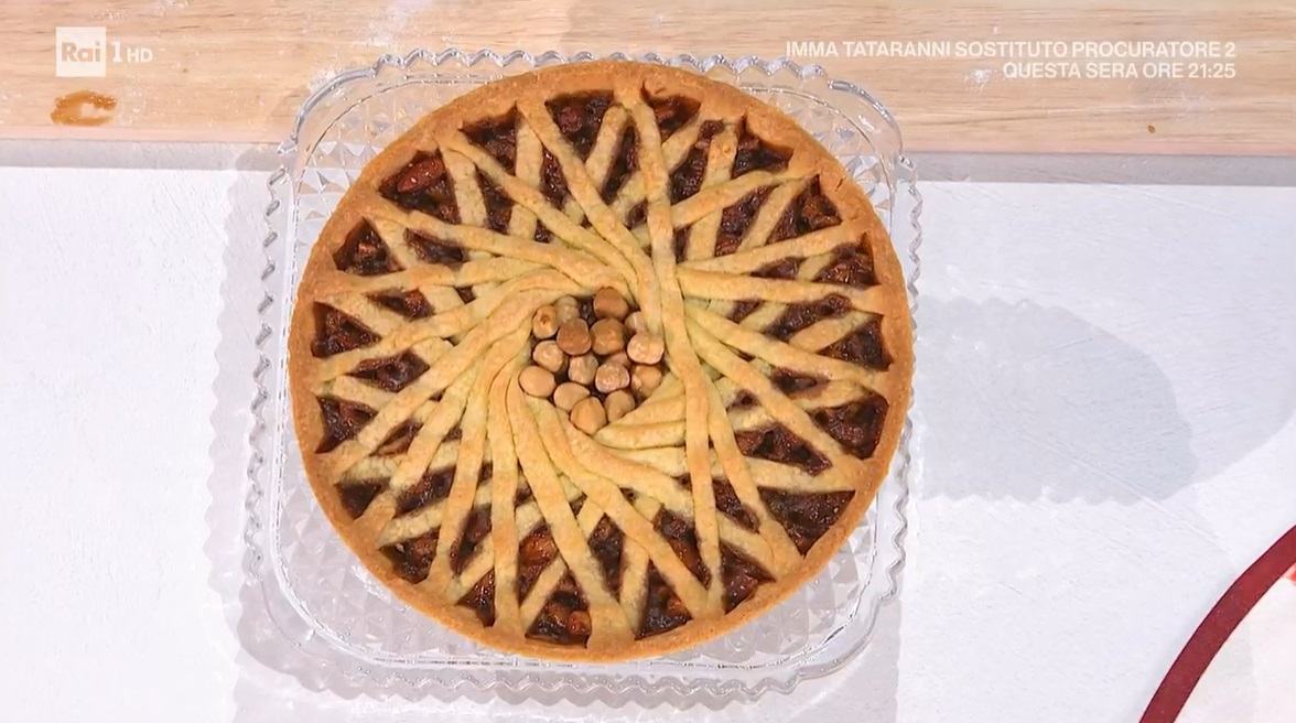 Prendiamo la frolla e la stendiamo con il mattarello ad uno spessore di circa mezzo cm. Imburriamo ed infariniamo una tortiera (possiamo usare lo staccante, qui la ricetta). Inseriamo all’interno la frolla, in modo da foderare il fondo ed i bordi: ritagliamo l’eccesso. Versiamo all’interno la frutta secca con il caramello e la livelliamo. Decoriamo la crostata con delle strisce di frolla: Natalia posiziona un bicchiere al centro e distribuisce intorno al bicchiere le strisce, sovrapponendole fino a formare il decoro in foto. Togliamo il bicchiere e mettiamo al suo posto delle nocciole sgusciate. Cuociamo in forno caldo e statico a 180° per 45 minuti.