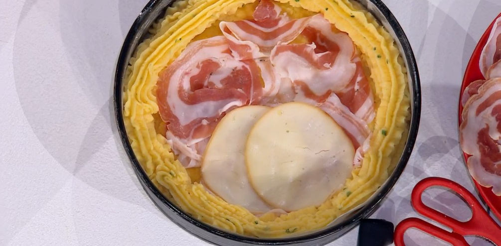 Distribuiamo sulla base della torta delle fette di pancetta piacentina affettata, sopra delle fette di scamorza.
