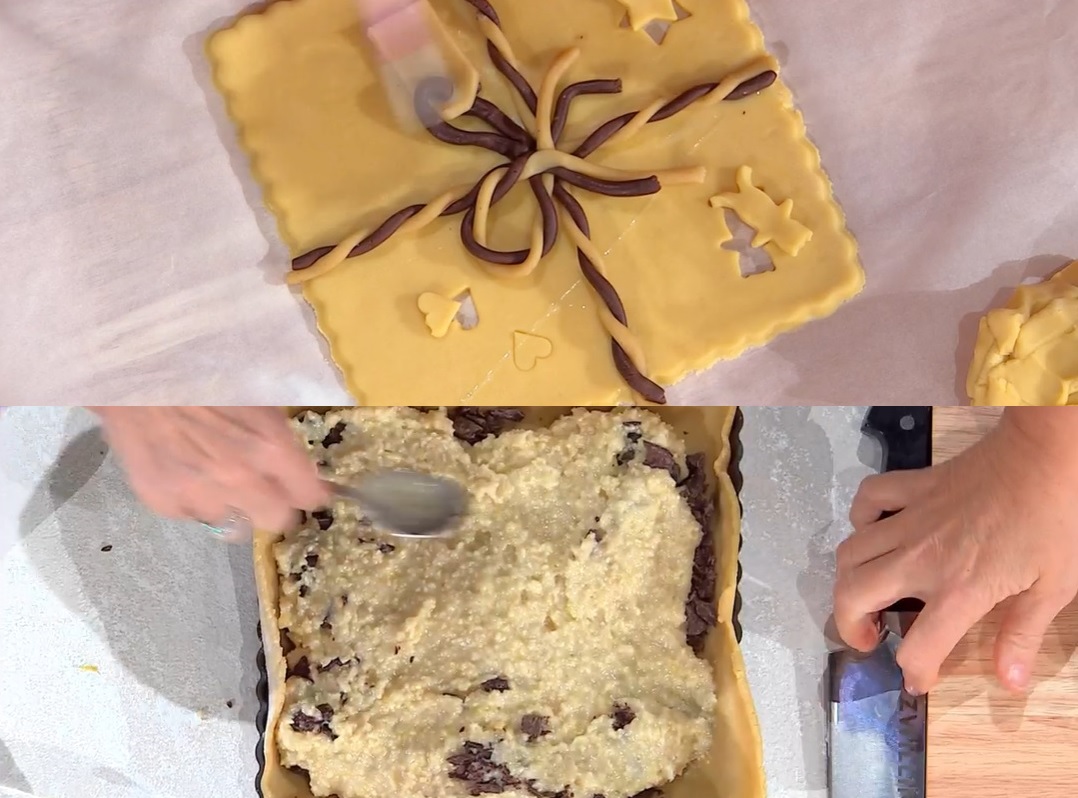 Stendiamo metà della frolla e ne ricaviamo un quadrato. Con la frolla avanzata e quella al cacao, formiamo due serpentelli, che intrecciamo tra loro. Incolliamo i cordoncini ottenuti sul quadrato di frolla, usando poco albume, in modo da creare un fiocco. Sul quadrato, inoltre, creiamo dei fori con dei taglia-biscotto delle forme preferite. Mettiamo in freezer: deve congelarsi.