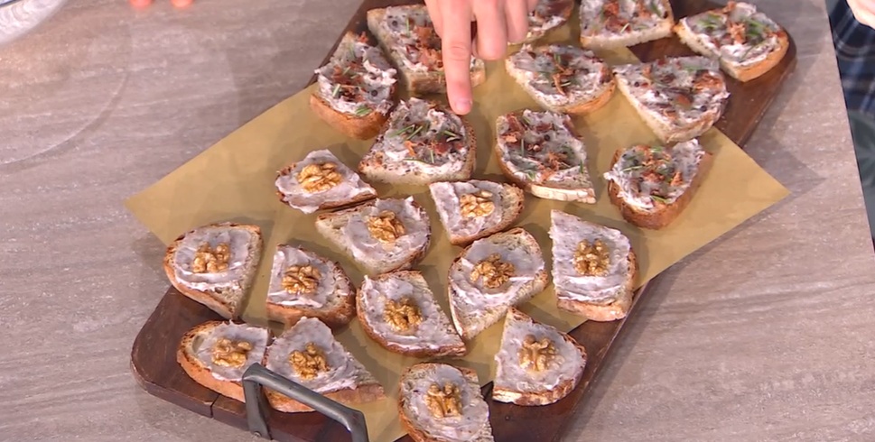 Affettiamo il pane, lo tostiamo e lo condiamo nei seguenti modi: tritiamo il lardo con aceto, mollica di pane e aglio e lo spalmiamo sul costino. Finiamo con noci e miele, oppure con pancetta, rosmarino e pepe.