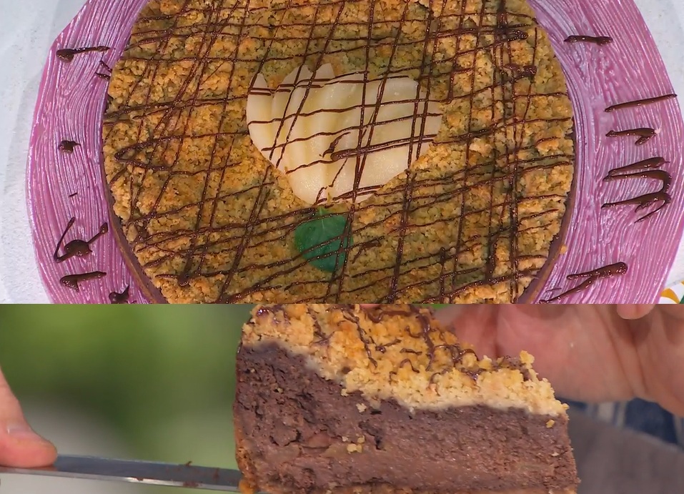 Versiamo metà della crema all’interno del guscio di biscotti, la livelliamo e disponiamo sopra le pere o altra frutta sciroppata e tagliata a spicchi. Copriamo con la crema al cioccolato rimasta, livelliamo e distribuiamo sopra il crumble.