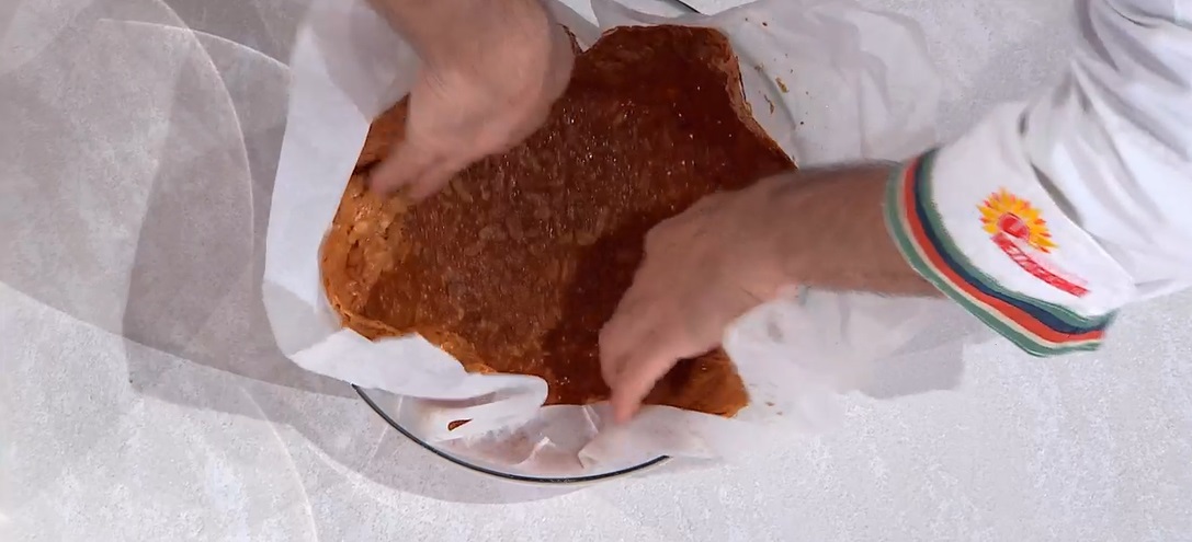 Per il cestino, in un pentolino portiamo a bollore la panna con il burro, lo zucchero ed il miele. Quando il tutto si è sciolto e sfiora il bollore, uniamo la farina e le mandorle a lamelle e mescoliamo sul fuoco. Versiamo il composto su una teglia foderata con carta forno. Sovrapponiamo un secondo foglio di carta forno e stendiamo con il mattarello, fino ad ottenere una sfoglia sottile. Togliamo la carta forno (quella sopra) e cuociamo in forno caldo e statico a 180° per 15 minuti. Appena sfornato, quando è ancora caldo, lo mettiamo all’interno di una ciotola, insieme alla carta forno, e lo lasciamo raffreddare in questa posizione, in modo che prenda la forma.