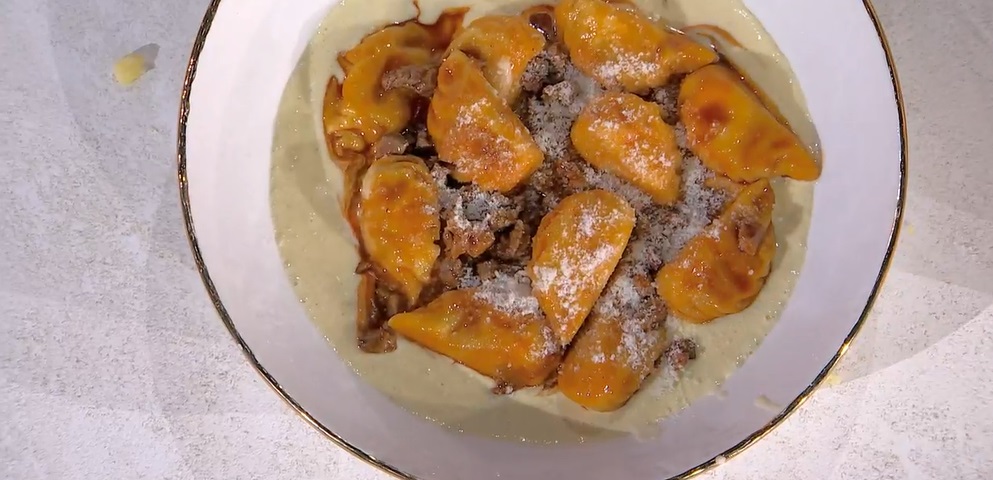 Scoliamo i culurgiones e li condiamo con la salsa di agnello. Li serviamo su un letto di crema di pecorino.