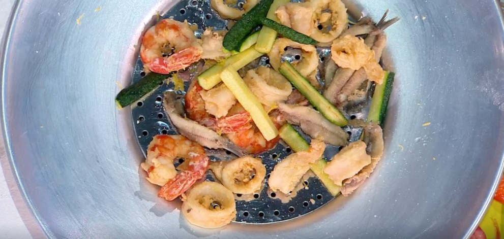Setacciamo insieme la farina 00 e quella di semola. Tagliamo a pezzetti il baccalà, a fettine le zucchine. Passiamo tutti i vari pesci e le fette di zucchine nelle farine mescolate, quindi li scoliamo e immergiamo a friggere in olio bollente e profondo (prima vanno messi i calamari, poi le zucchine e per ultimi i gamberi). Una volta ben dorati, scoliamo e asciughiamo bene, quindi rinfreschiamo con della scorza grattugiata di limone, poi saliamo e serviamo.