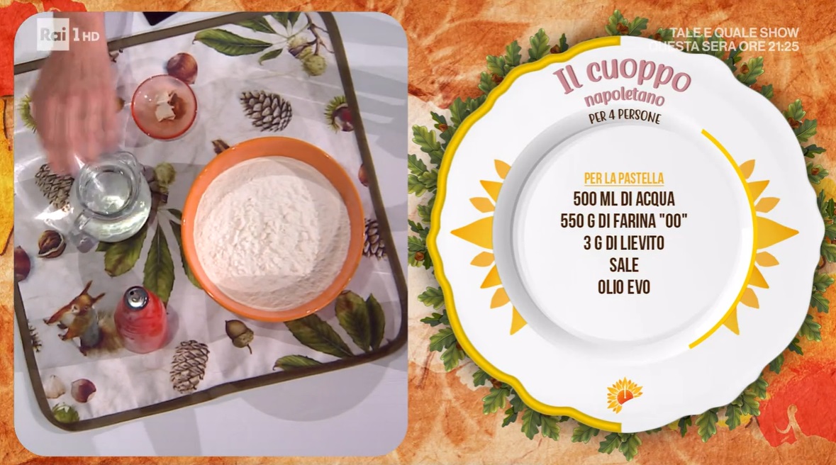 - Pastella: 500 ml acqua, 550 g farina 00, 3 g lievito di birra, sale, olio evo