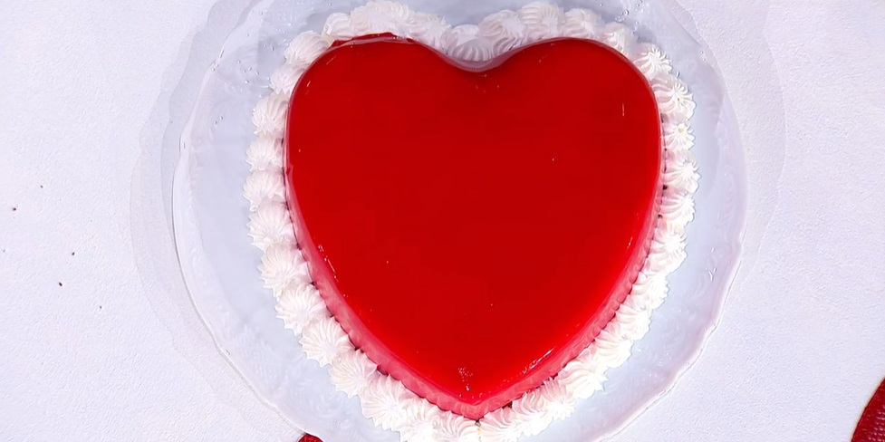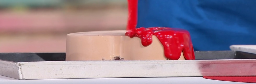 Prepariamo la glassa: in una pentola, mettiamo il glucosio, lo zucchero, il cioccolato bianco tritato, il latte condensato e, a fuoco basso, mescoliamo fino a sciogliere il tutto. Uniamo la gelatina reidratata in acqua fredda e mescoliamo fino a scioglierla. Aggiungiamo il colorante rosso e frulliamo con il mixer ad immersione fino ad ottenere una miscela uniforme.