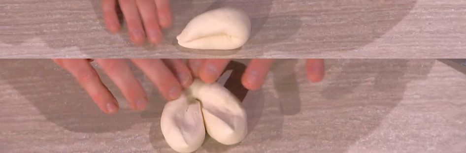 Allunghiamo ciascuna pallina, formando un filoncino sottile sulle punte. Pieghiamo a metà (foto), congiungendo le due punte. Tagliamo a metà la parte più spessa, quindi rigiriamo le due metà ottenute, formando il cuore (foto). Disponiamo sulla teglia, copriamo e lasciamo lievitare ancora 1 ora.