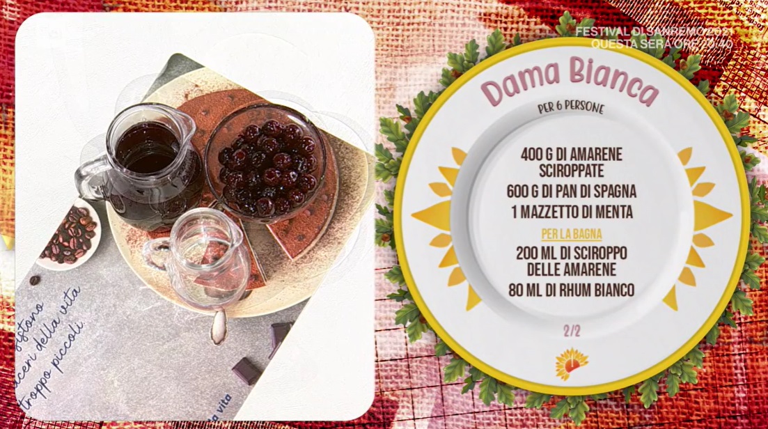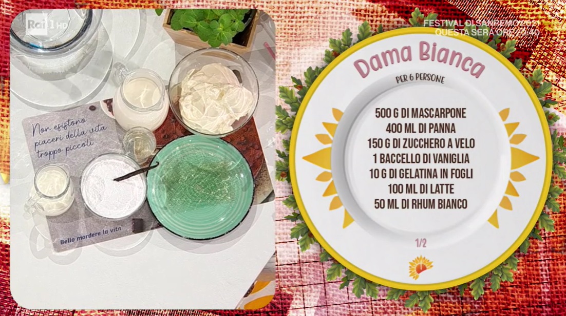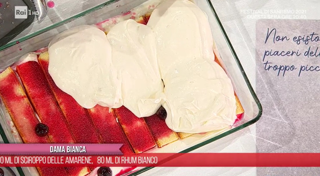 dolce dama biancaPunzecchiata dall’amico di una vita, il tagliente Daniele Persegani, Zia Cri si appresta a preparare un golosissimo dolce, ascoltando in sottofondo le canzoni di Arisa, ovvero l’ospite in collegamento di oggi. Ma veniamo alla ricetta e vediamo come preparare la dama bianca, un dolce tipico romagnolo.