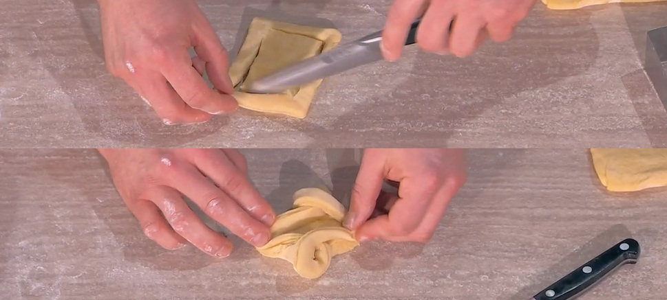 Stendiamo l’impasto con il mattarello ad uno spessore di 1 cm. Ritagliamo dei quadrati; con il coltello, incidiamo i lati (foto) ed invertiamo i due lembi ottenuti, portandoli ciascuno all’opposto.